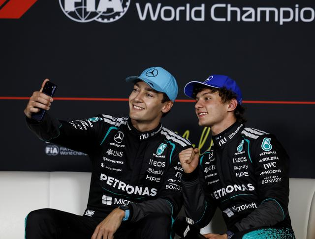 ↑ 梅赛德斯车队车手拉塞尔(左)和队友安东内利出席排位赛后的新闻发布会。 新华社记者 马平 摄