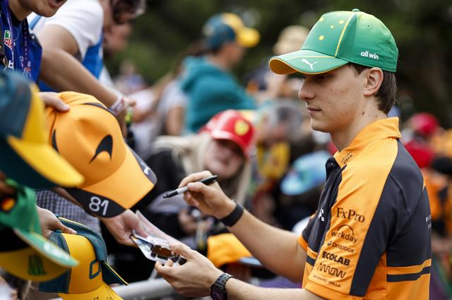 ↑ 迈凯伦车队澳大利亚车手皮亚斯特里在排位赛前与车迷互动。 新华社记者 马平 摄