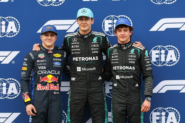 ↑ 获得排位赛前三名的梅赛德斯车队英国车手拉塞尔(中)、其意大利队友安东内利(右)和红牛车队法国车手哈贾尔赛后合影。 新华社发 (钱俊摄)